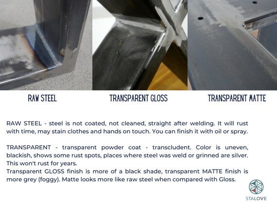 **the square metal dining table legs are sanded and finished with bowling alley wax if selected to preserve the raw metal patina and prevent from rusting indoors.